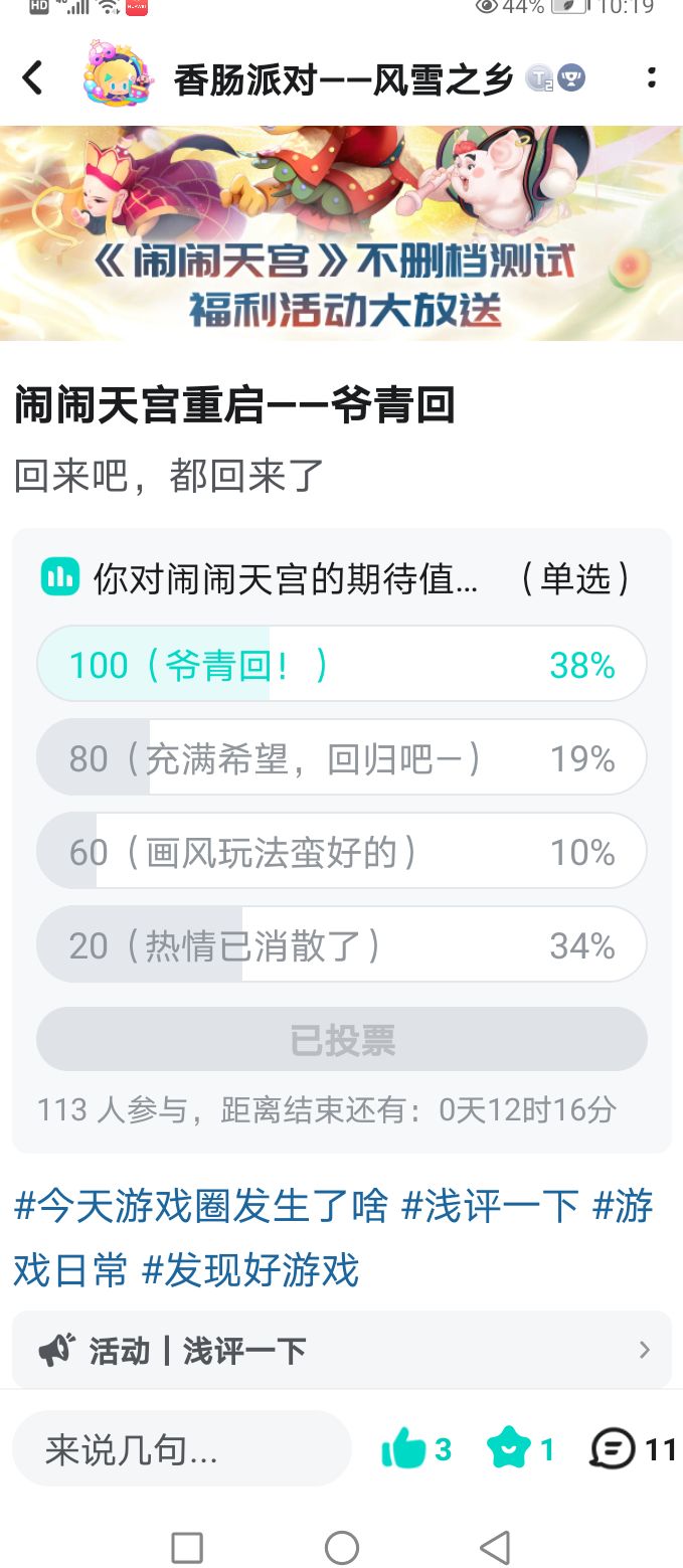 首先先说说闹闹的优点一.1.本人也是闹闹的老玩家了,本人前天发起了一个投票(参见上图二),我们能清晰的看到有一百多人参与,其中约70%的玩家对闹闹充满兴趣,更有近60%的玩家对闹闹回归兴奋激动。