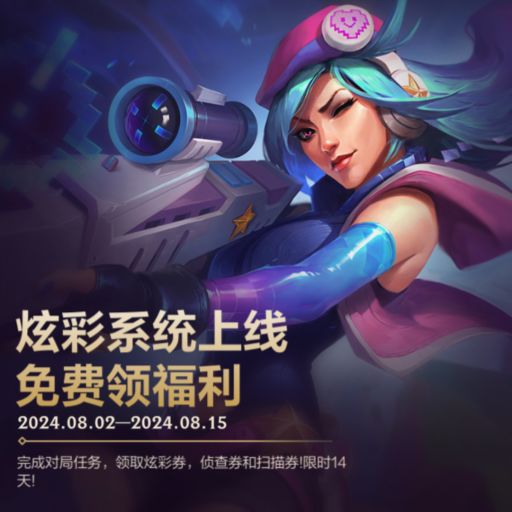 炫彩系统专属福利仍在继续!截止至8月15日,召唤师完成对局任务即可领取炫彩券*10、侦查券*6及扫描券*5奖励,可用于炫彩系统中使用获取炫彩皮肤哦~