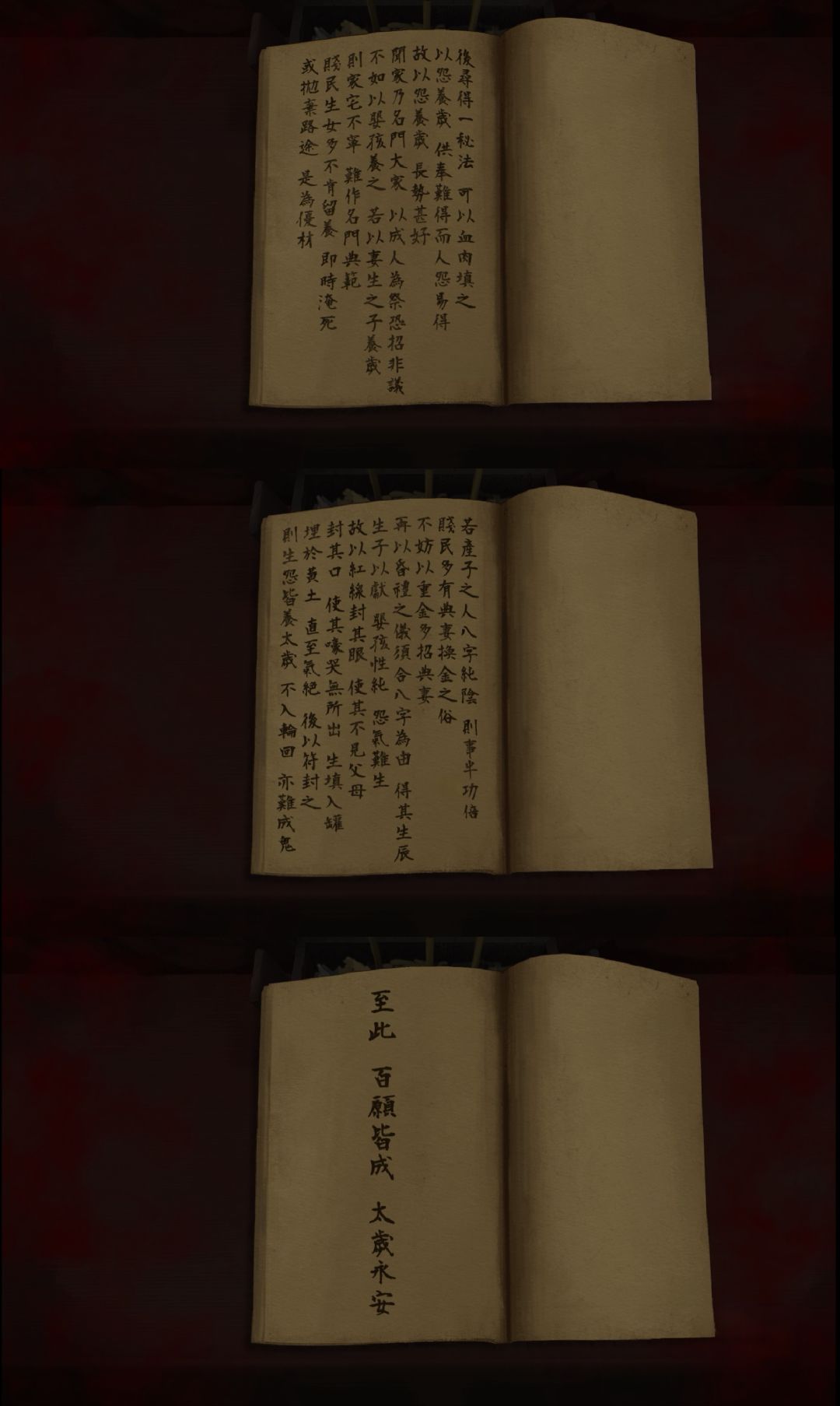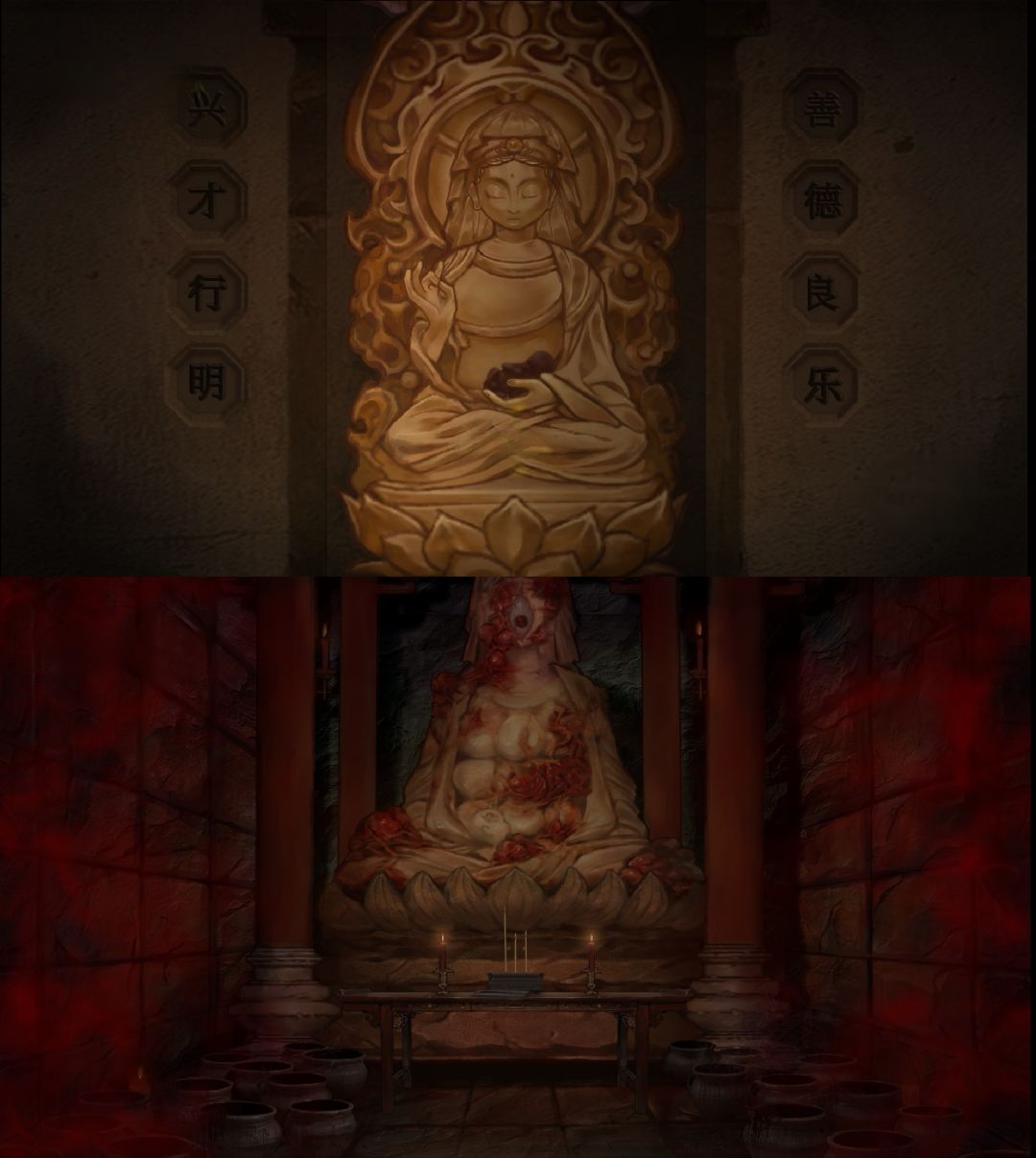 一个恐怖、暗黑、血腥的中式解谜游戏。故事情节画面让人恐惧、震撼,却又透露着无可奈何的悲哀。