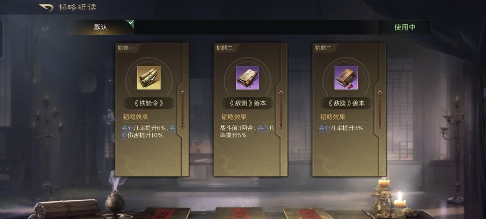 由于大乔身在其中,故而此战的阵型必是箕形阵,大乔携带着国色、避其锐气和知人善任挡在前排。韬略库研读的三本书,依次是练士善本、相思文赋和守土善本。作为这支队伍里智力最高的角色,大乔吃到了知人善任的减伤和抵御保护。