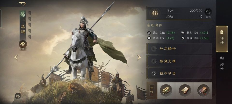 马超在战法搭配上,严格遵循的老三板斧的原则,纵马横枪、摧坚克难和锐不可当,会心、破甲都有着落。算上专属金书铁骑令和敌阴、敌腹的善本增益,马超又能从自己的韬略库里获得14%的会心几率以及10%的会心伤害提升。