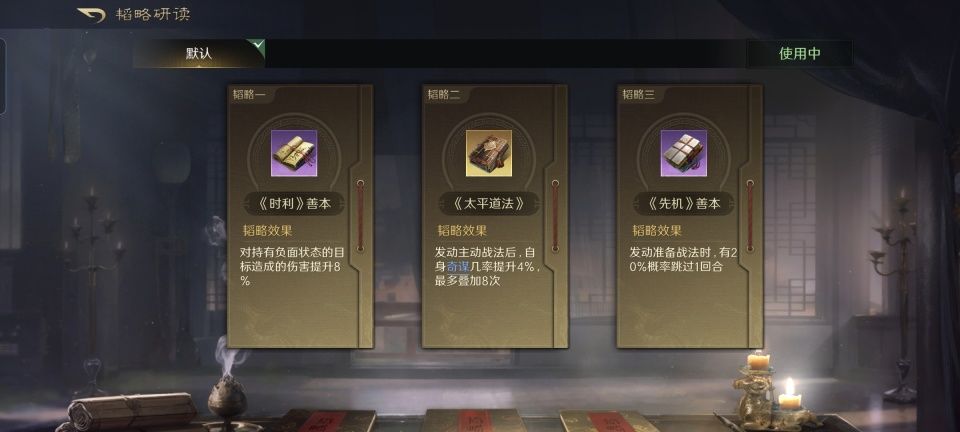 张角韬略库里的三本书,依次研读了金书太平道法以及时利、先机的善本,对于持有负面状态的敌人还能提升8%的伤害,并最多叠加8次奇谋。剑盾兵的专精是浴血奋战,热烈欢迎对面的敌人给他施加异常状态,反而可以让他的输出更猛。
