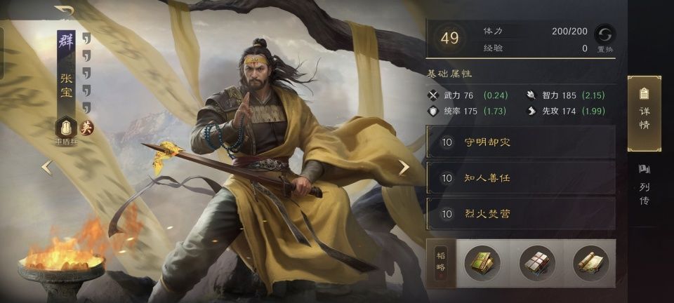 话本版的张宝,在这支队伍里是最为关键的承前启后。守明却灾可谓是同时照顾到了张梁的兵刃伤害提升和张角的谋略伤害提升,会心和奇谋可以给到两个人,这比洛神更棒。第二战法知人善任和第三战法烈火焚营,则是完全为了服务张角才学的。张角是三宝队里当之无愧的首席智囊,所以减伤和抵御都给了他。