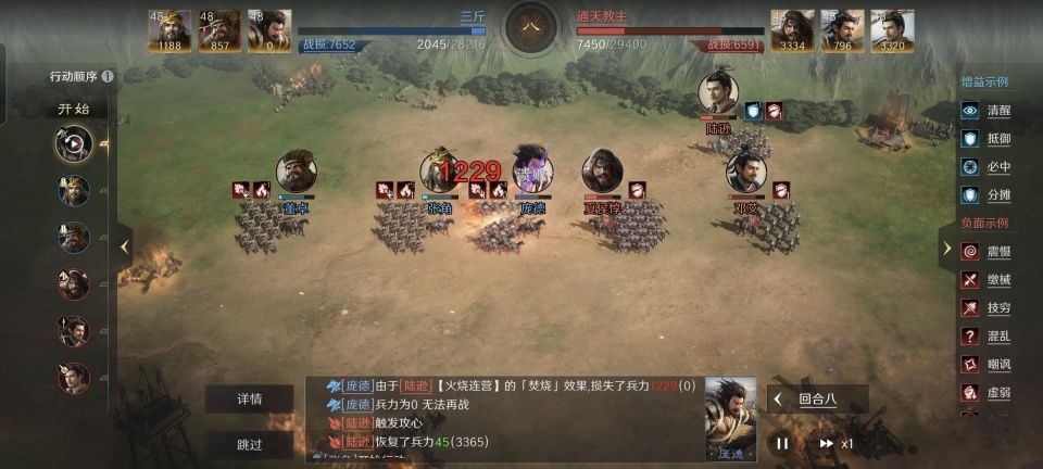 楼上的夏侯惇和邓艾已经做好了舍命挡庞德的准备,那么陆逊要做的就是不辜负他们的牺牲,全力为队伍争得一胜!由于韬光养晦和韬略库里励心、机动手抄的加持,陆逊的主动战法火烧连营的发动率被提升到了72.7%,加上出其不意可以结合火攻打出更加高额的伤害,这火力值是真的稳!