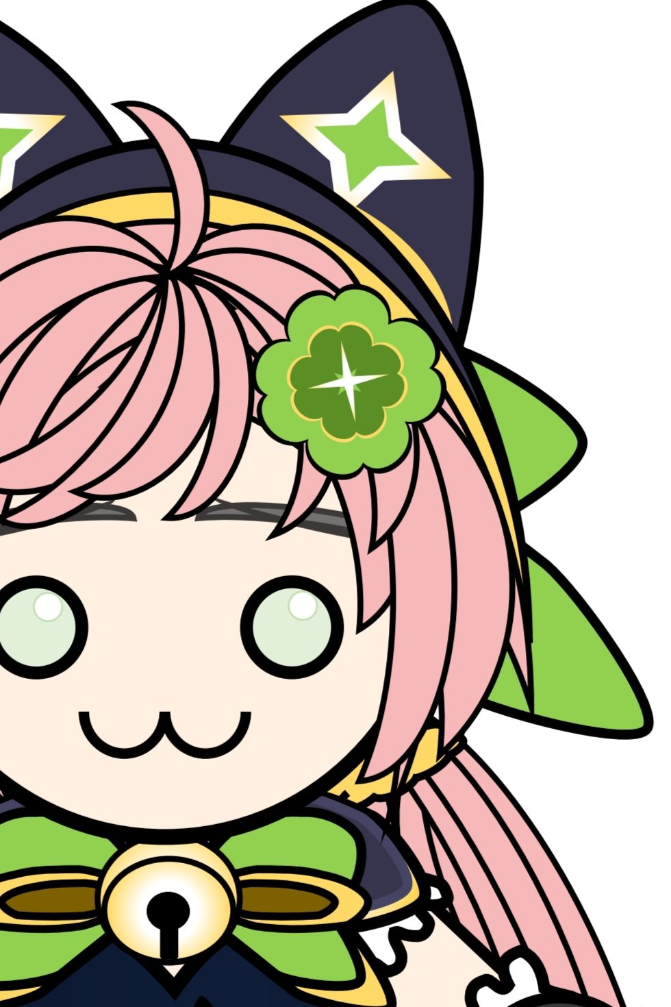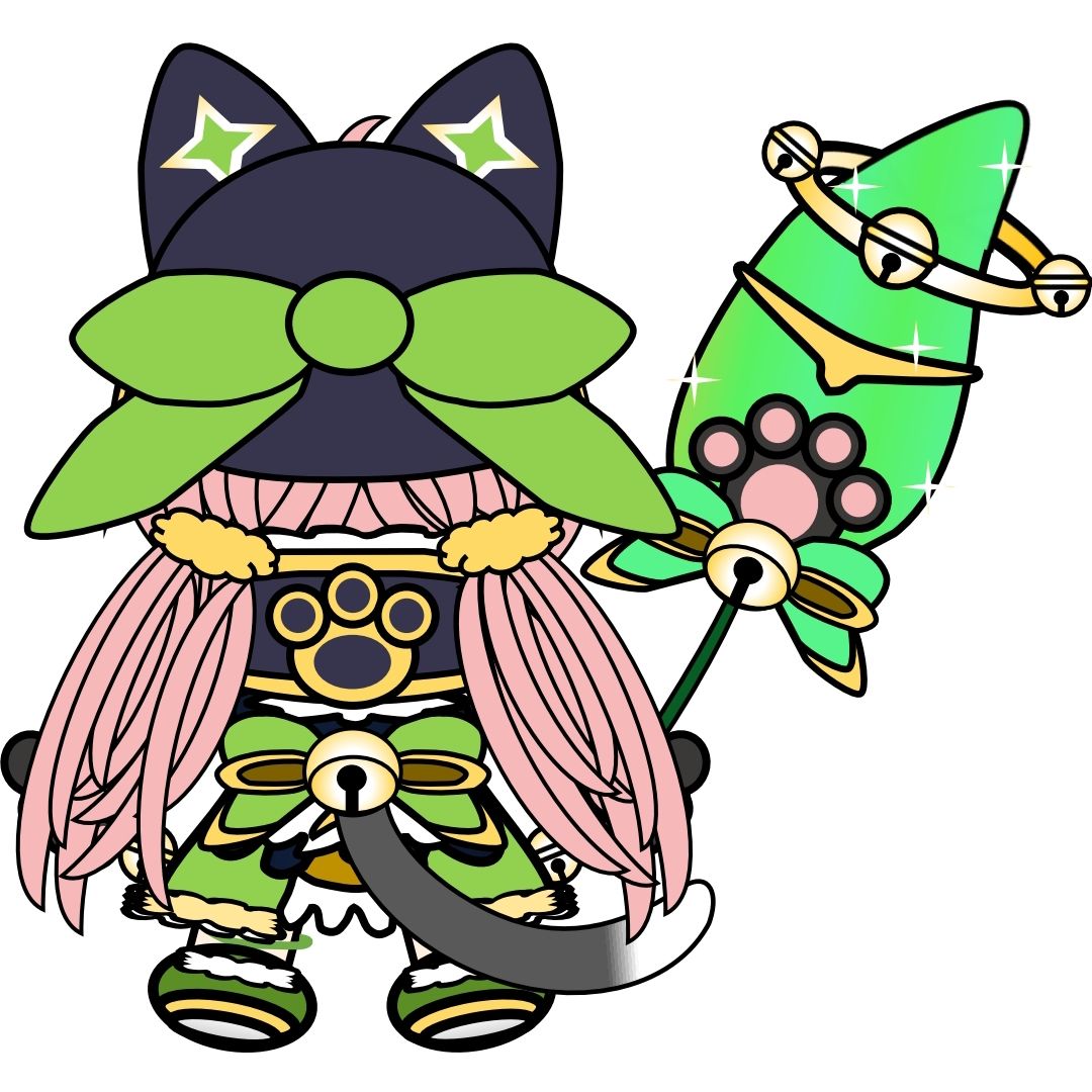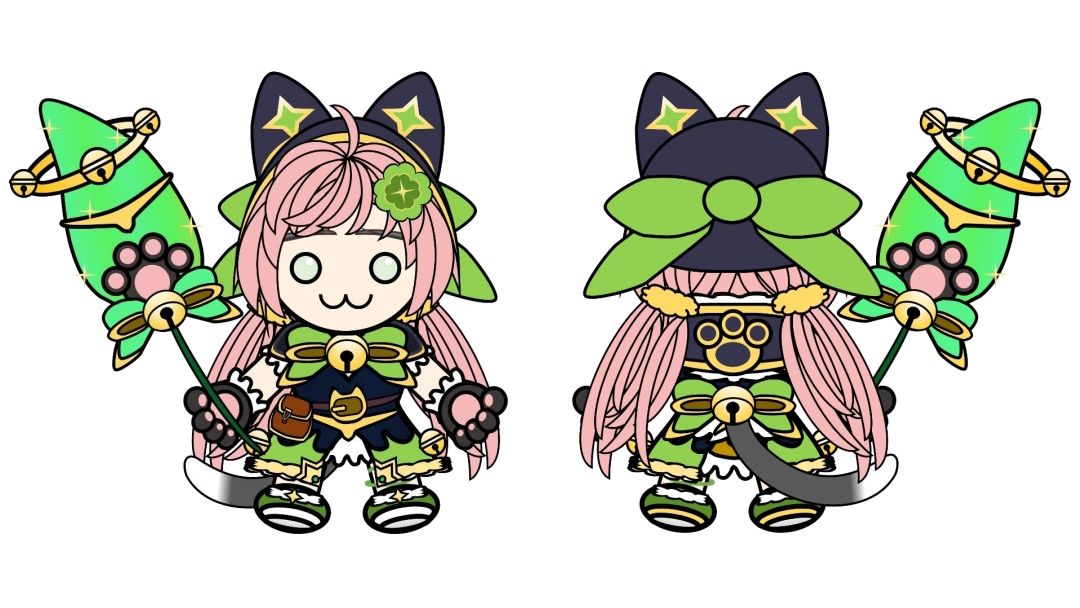 和以往的角色不同,猫神眼睛不是全白的白目,是有淡淡的浅绿色。耳朵的花纹修改成星星,四叶草头饰内的深绿色花斑也改成四叶草,双倍幸运有没有!