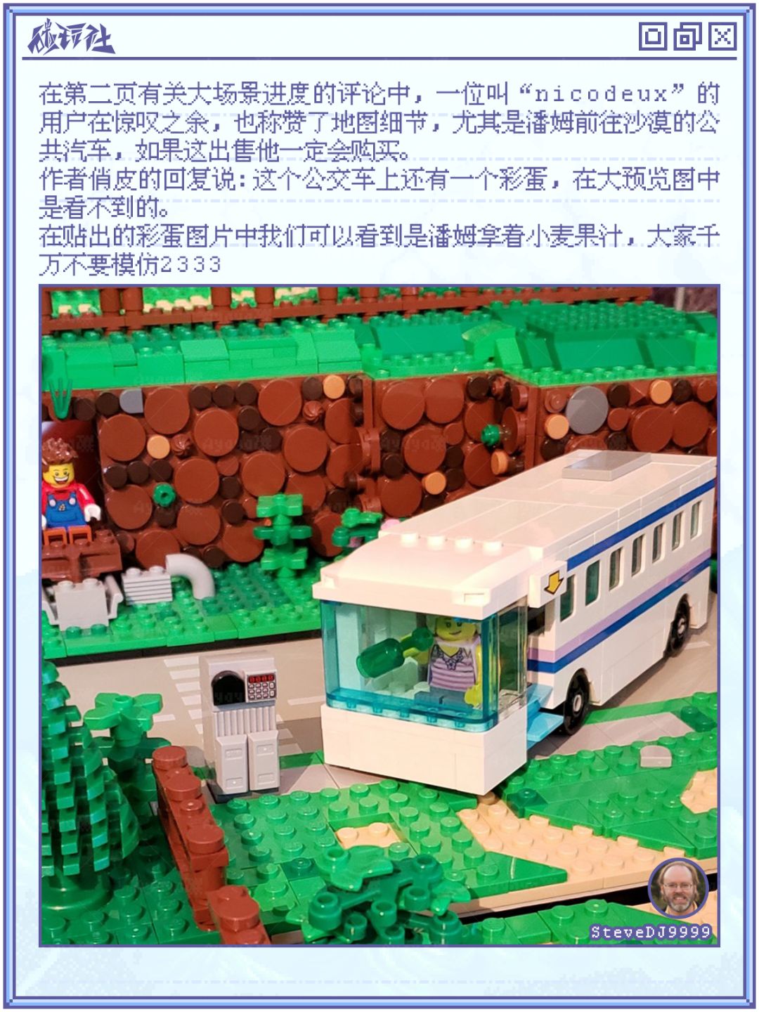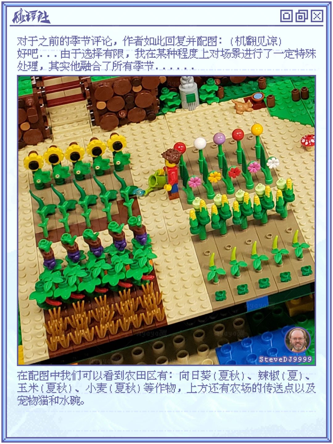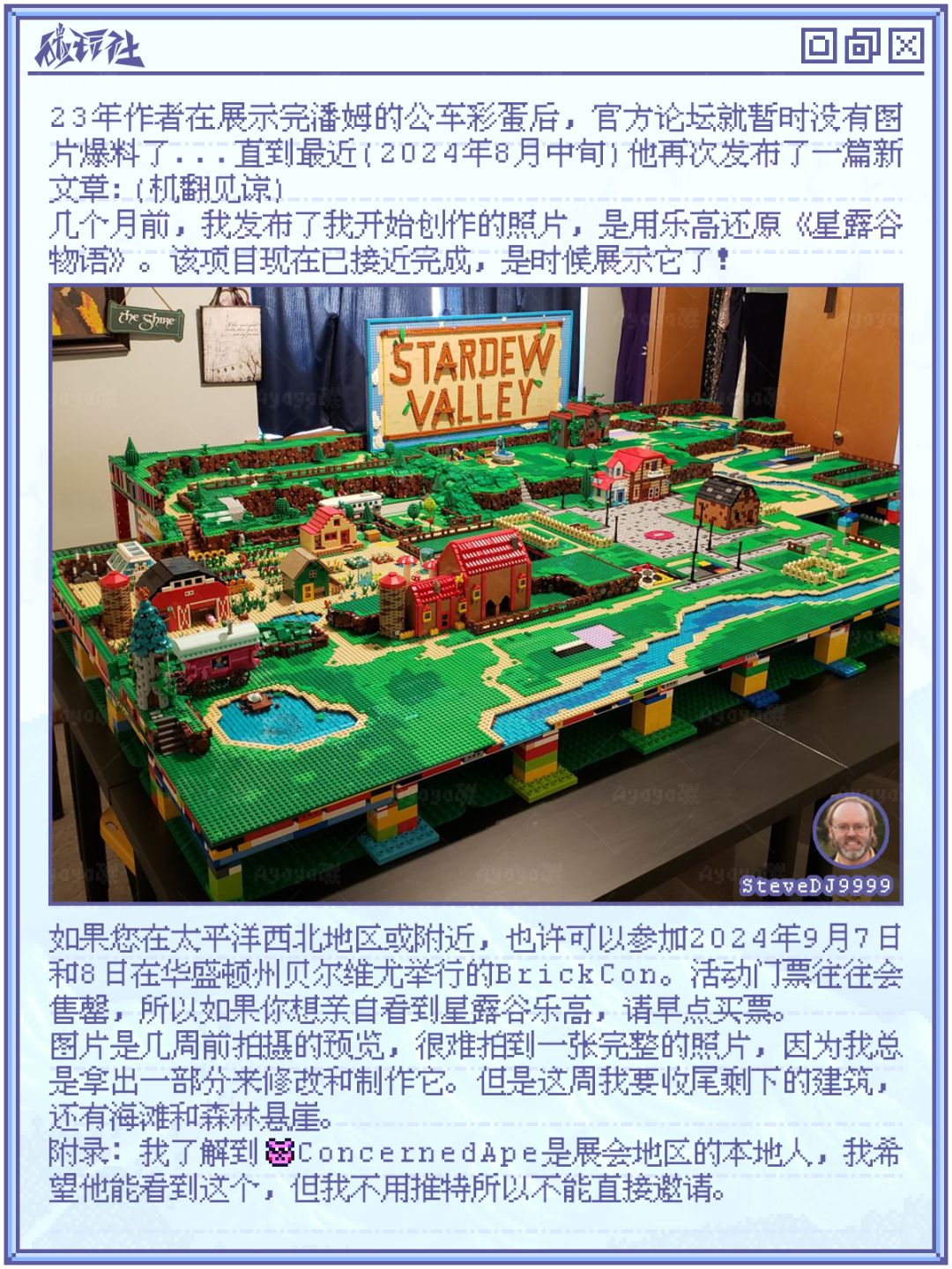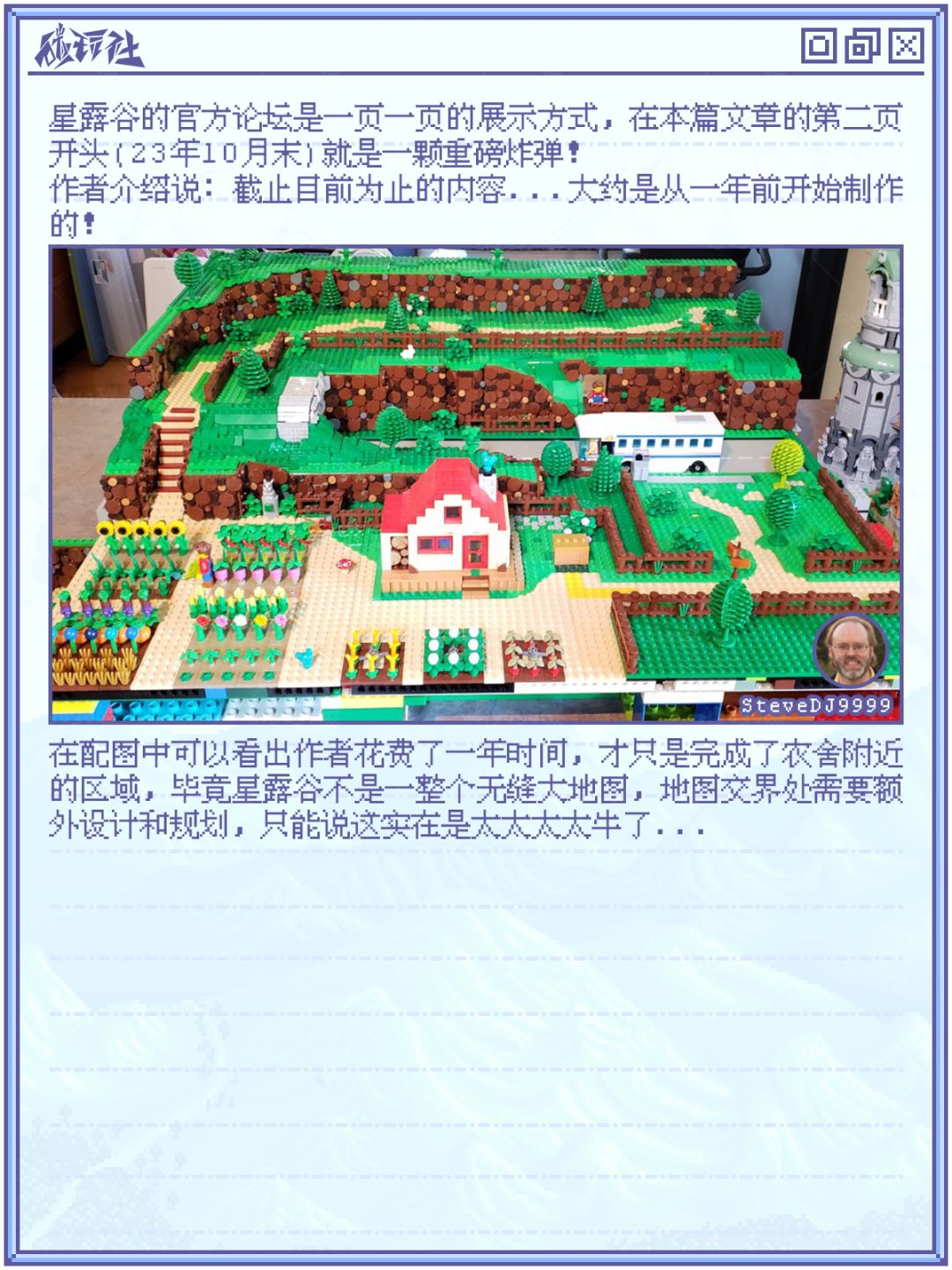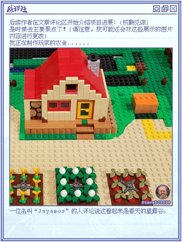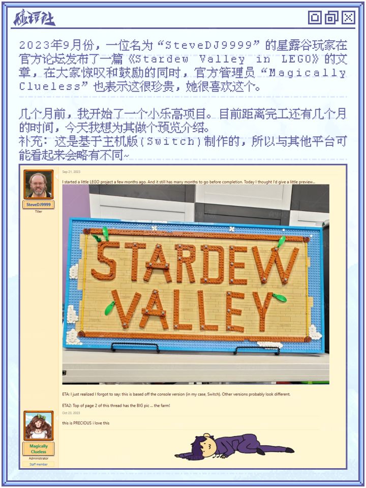 2023年9月份,一位名为“SteveDJ9999”的星露谷玩家在官方论坛发布了一篇《Stardew Valley in LEGO》的文章,在大家惊叹和鼓励的同时,官方管理员“Magically Clueless”也表示这很珍贵,她很喜欢这个。