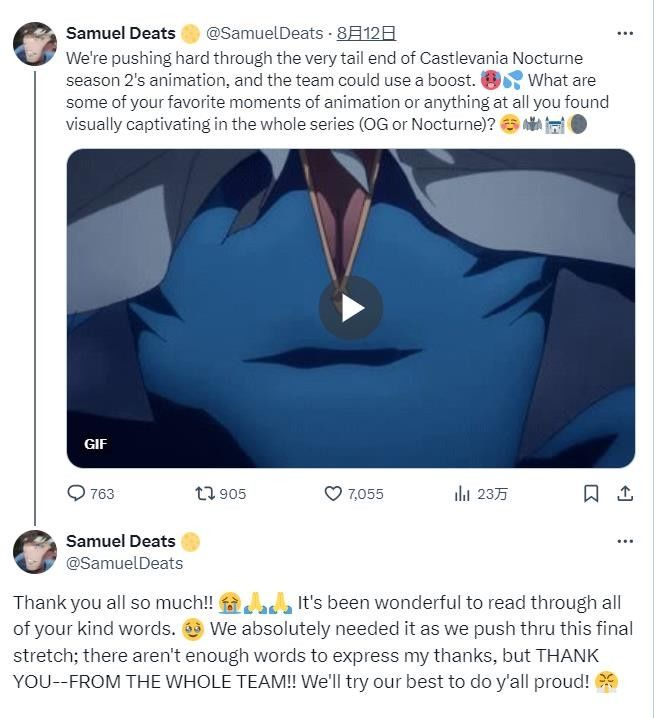 根据动画《恶魔城:夜曲》总监Samuel Deats透露,《恶魔城:夜曲》第二季目前已进入最后制作阶段,开发团队正在努力做“最后冲刺”,可能我们很快就能看见第二季的正式公告和播出时间了。