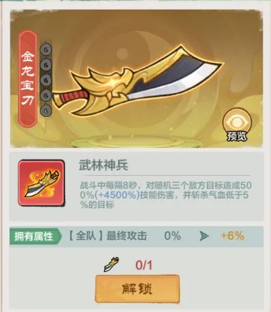举世闻名的金龙宝刀是前期最受大侠欢迎的【斩杀】神兵,一旦错过了需要等待12次【武林夺宝】才能再次获取,大侠可要把握好机会,该出手时就出手哦。适时购买[夺宝达人卡]可以助大侠一臂之力哦~如果大侠前期暂无预算入手,可以囤好[转盘奖券]等待金龙宝刀的下次返场,这样就能白嫖神兵啦。