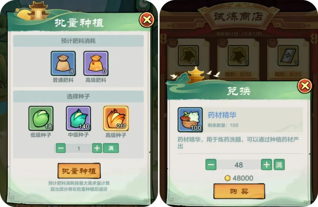 在冲榜关键期,大侠们也可以使用肥料,缩短生长周期,或者在试炼商店内直接兑换药材精华,必要时可以购买庄园基金,让我们在完成任务的同时获得更多奖励哦。