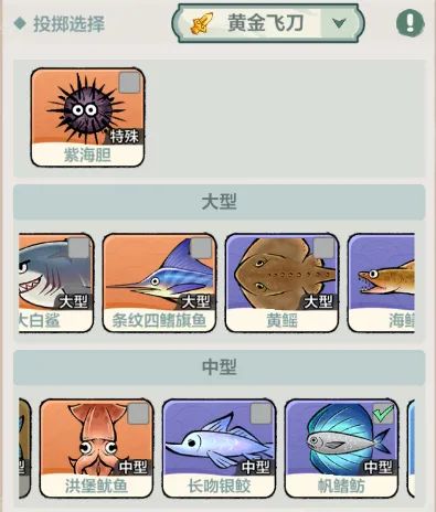 紫鱼侧有黄鳐、海鳝和长吻银鲛;红鱼侧有紫海胆、大白鲨、旗鱼、鱿鱼、皇帝神仙鱼。尤其是像大白鲨、旗鱼、黄鳐和海鳝这些体积特别大的鱼,很容易被黄金飞刀蹭到。