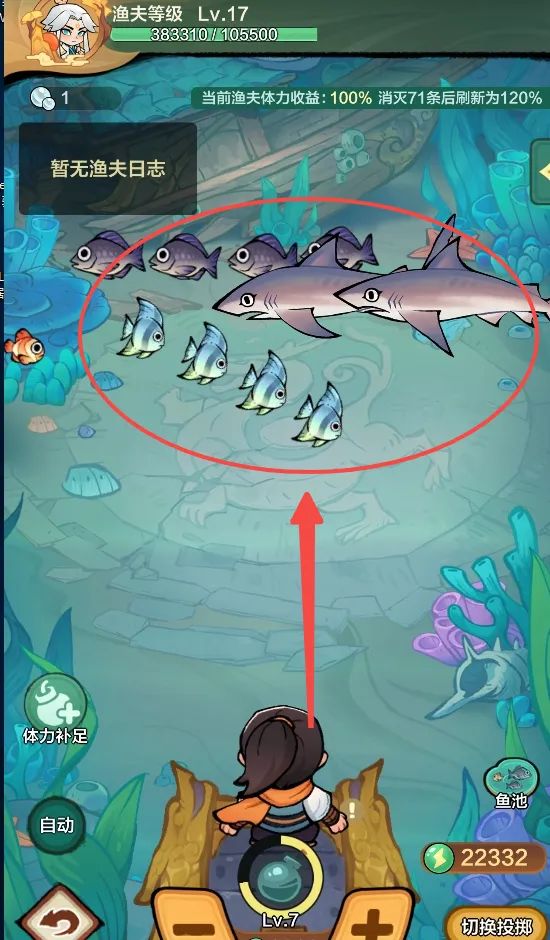 挂机尽量只挂鱼群,对升级图鉴有需求可以增加其他紫鱼,如黄鳐、大西洋安康鱼。