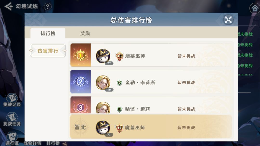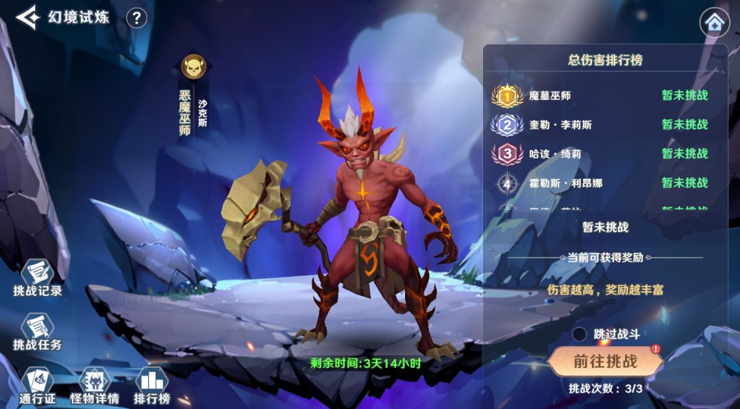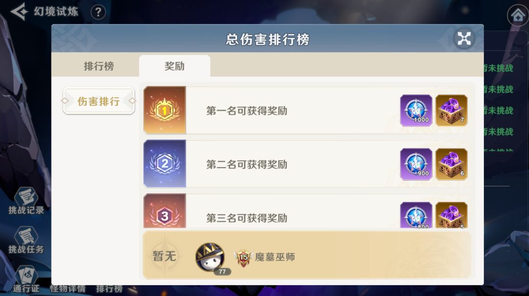 3.幻境开启期间,冒险者可每天进行3次挑战,每天记录当天挑战的最高1次伤害作为排名的依据,结算时将根据冒险者周一至周五累积的