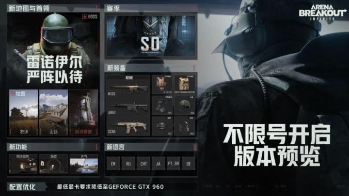 腾讯游戏旗下《暗区突围:无限》端游现已在官网开启不限号测试,最低显卡需求得到优化,降低至 GeForce GTX 960 便可游玩,游戏目前 Steam 锁国区,感兴趣的玩家可以去官网参加不限号测试。