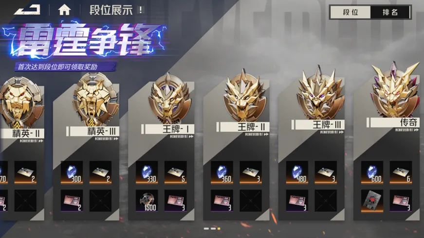 然后关键是PVP的排位赛奖励,这是直接把天地劫、梦战当中的PVP排位赛给照搬过来的样子啊,段位一共分为13个,其中第1-12个段位分别是斗士1-3、先锋1-3、精英1-3和王牌1-3,最后一个段位则是传奇段位。那么此次排位的奖励维一也大致统计了一下,考虑到精英1这个段位有一个皮肤奖励,这点设定和天地劫、梦战的皮肤奖励门槛也比较类似,此外如果我们按照不同的段位结算来看奖励的话: