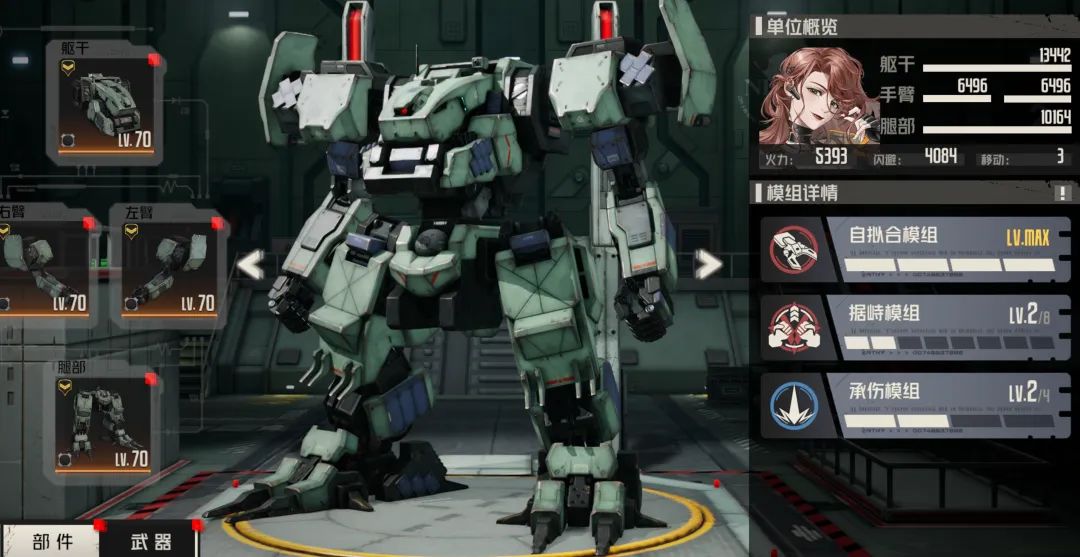 然后是卡夏的专属机兵“恐颌”,这个机兵的数值设定的还是比较高的,同时在模组方面官方也比较敢放水了,基础模组“自拟合模组”可以对未损坏部位的敌人造成最高25%的增伤,然后“据峙模组”可以最高带来8级18%的增伤,这两个加在一起便是43%的定向增伤提升,且反击距离还能提升1格,最高卡夏能有4格的反击距离(这点还是比较重要的)。所以这个机兵客观说......效果不错,其总出力为2105,空载重量为955,会剩下1150的出力,卡夏装备双最高品阶的机枪和一个基础背包后刚好凑够2105的出力,一点都不剩......