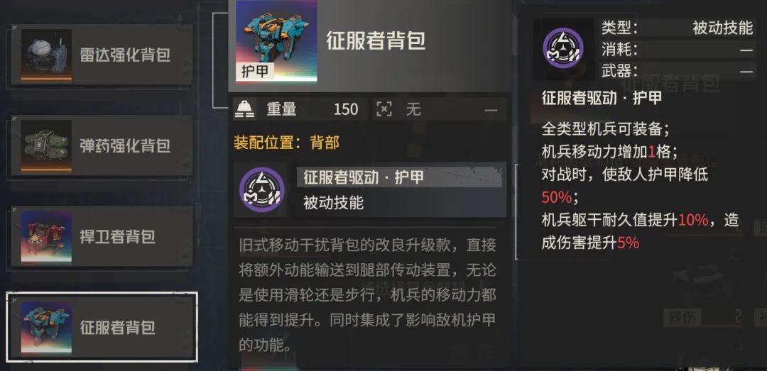 然后关键点又出现了,此次更新也是加入了两个“彩色背包”的设定,其中“捍卫者”可以展开光环效果,整体就是一个PVP限定被动的模式;然后“征服者”背包则是全机兵可带的提升移动力的效果,同时可以降低对方的护甲值,因此这个征服者背包应该会成为未来的一个香饽饽,很多突击机师都会第一时间来考虑这个背包。