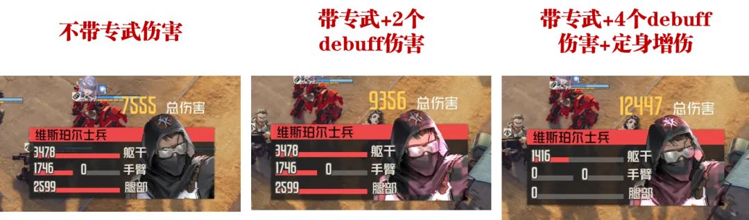 那么这个专武一是可以定向提升白月的输出伤害,1-4个debuff按数量增伤,常规状态下白月自身的光环算一个,然后赫拉克勒斯的模组算一个,然后【碎月】点头击杀敌人后的定身状态算一个,最后如果白月能带上【钢锋】这个技能,则自身都可以形成给对方4个debuff的全增伤条件。