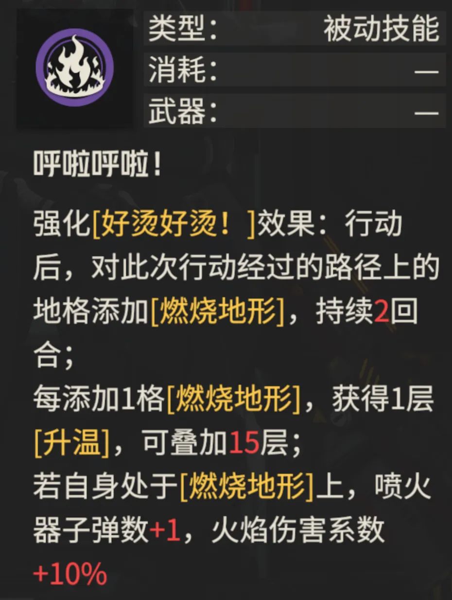 这里针对在“燃烧地形”上的敌人会增伤20%,然后绘梨沙在行动后的格子都会被施加“火焰地形”,因此其积累“升温”buff的效率还是不错的,一般来讲第2回合都可以积累出第一次的15层“升温”,从而回复2点AP,最后则是自身处于“火焰地形”上时子弹+1,那喷火器的本来子弹数位8颗,这相当于就是12.5%的提升,此外火焰伤害系数还有10%的提升,这里我们就直接上伤害实测对比吧。