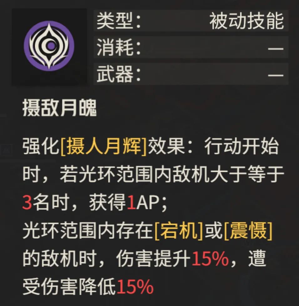 接着此专武的天赋强化效果可以为白月额外带来AP回复和定向的增伤与减伤能力,其中回1点AP的效果只能算是中规中矩,经过部分关卡的实测体验,其触发的频率可能并不会特别高;接着定向增伤/减伤15%的这个效果也是需要如利用【碎月】提前击杀敌人后方能触发的,考虑到【碎月】的AP消耗等问题,此定向增伤触发的频率也只能算是中规中矩,不过全彩的赫拉克勒斯因为可以给对方有+1回合debuff施加的效果,所以其能享受到这个效果的频率也会相对更高一些。