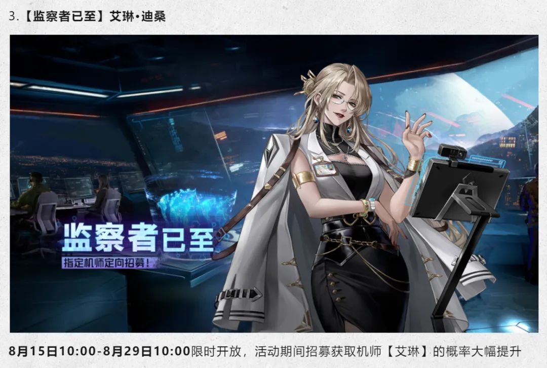 接着8月15日马上会跟着的有艾琳的池子,针对部分还没有拿到艾琳的新人玩家这算是个不错的消息,毕竟1.7下半版本的新角色是战术家,但是是一个用导弹的战术家,几乎不会对艾琳产生太大的冲击,她的地位也会继续稳固持续下去。