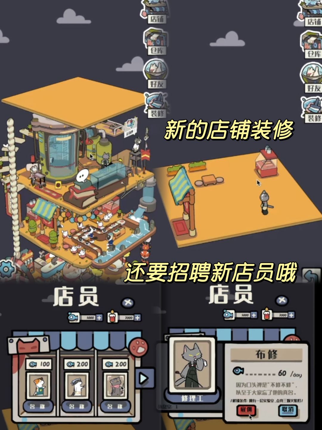 🌼《猫咪天堂》是一款模拟经营游戏,在服务楼层收集顾客们带来的蜡烛货币~在研究楼层培养鱼类,提供原材料~在商业楼层招待你的顾客们~当你足够富有了便可以不断往上搭建新的楼层~自由装修你的店铺,雇佣猫咪员工,来打造你的猫咪摩天大楼吧!