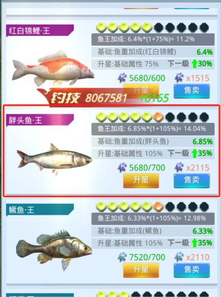 鱼王养成的基础鱼重加成为6.85%,鱼王升星将【鱼重加成】提升至14.04%