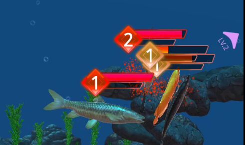 4.局内吃下敌对鱼王或者小鱼小虾可获得经验提升鱼王等级,等级提升后鱼王的【移动速度】,【攻击力】,【血量】都会相应的进行提升;