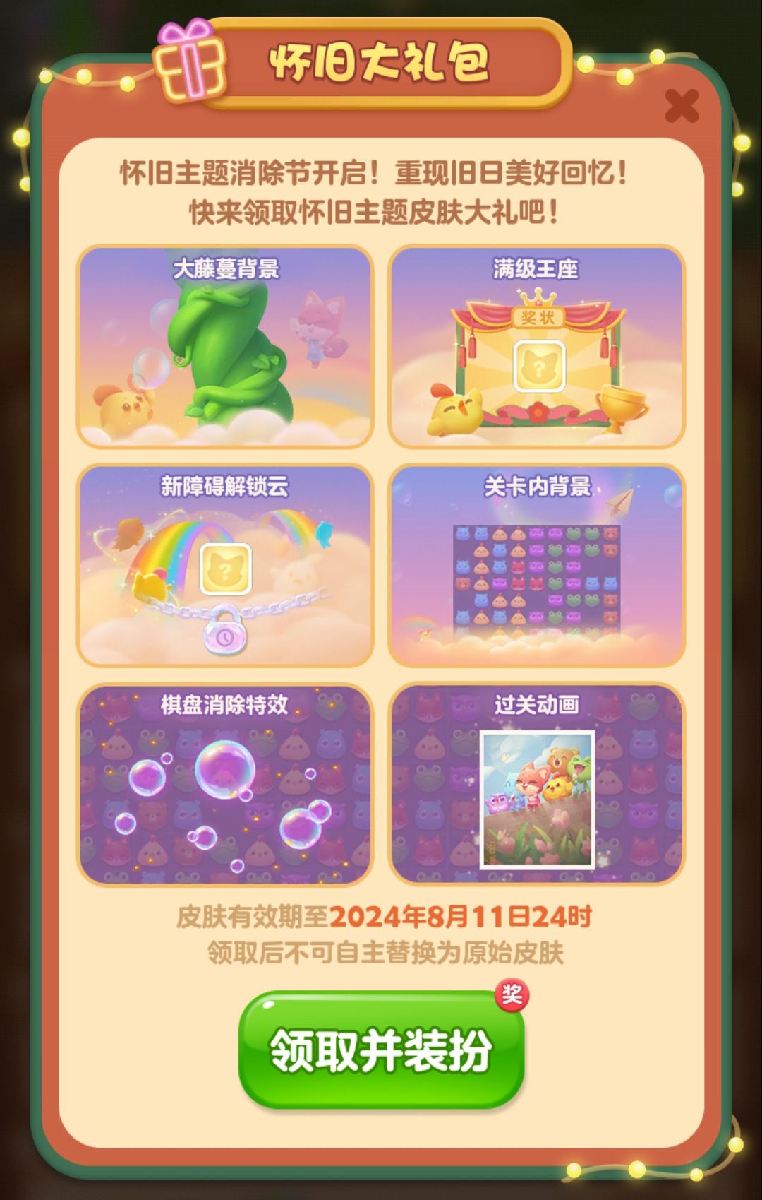 而氛围营造除了靠主题活动外,大藤蔓与关卡内的特效也是随之一变,开心消消乐的大藤蔓换上了怀旧大礼包~读书时代的大红奖状变为了满级王座、新障碍元素的解锁云变为了彩虹桥、关卡内的棋盘背景出现童年纸飞机,棋盘消除特效有了小时候最爱吹的泡泡,通关动画更是出现了多张小动物们的合影照片,给人一种又新鲜又怀念的感觉!