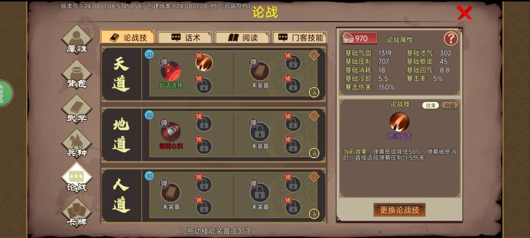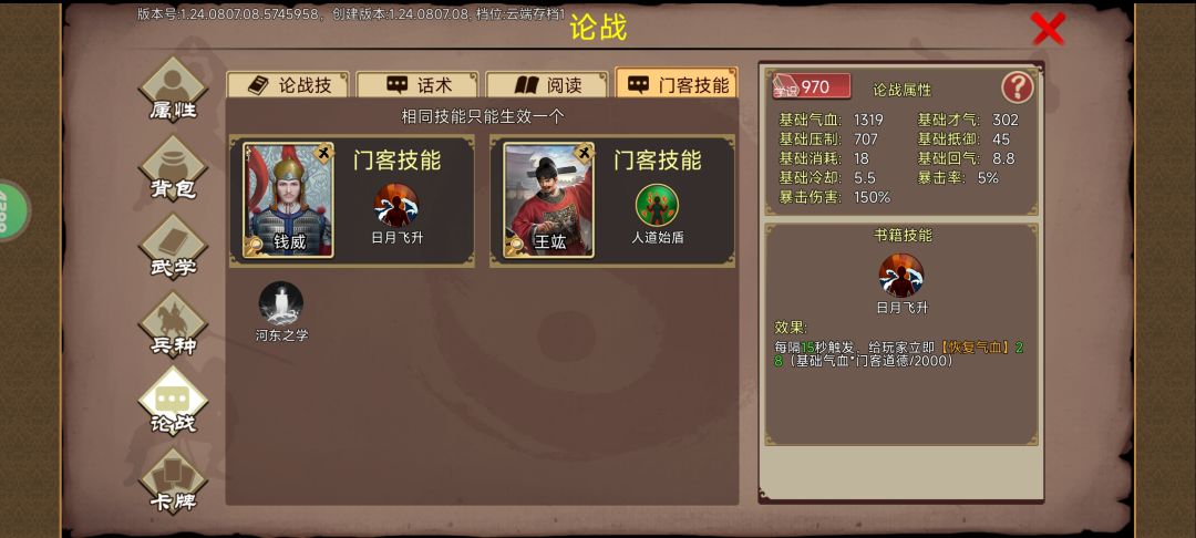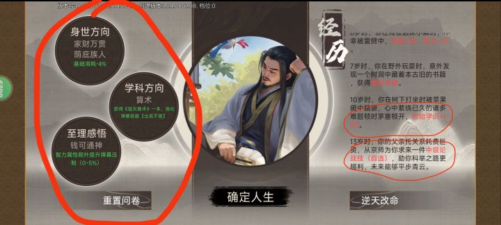 开局自由模式-大明王朝-文坛巨星;人物用庞统注意要解锁红书九章算术;文学卡牌我只有几张论战卡有用没有读书卡;随从随便带一个;注意难度:地狱自虐;其他设置:书生门第;学科选择算术,经历要刷学识+100和中级论战技;进游戏以后选叠翠学院。第一个月先读书到深夜,然后去东城区-隐士-获得副职游士;再学到第二个月凌晨去书院里找每个人点进去智取身上的书拿过来学了,基本上可以拿好几本。要熟读红书和绿书就有两个技能了,然后中级论战技选择抵消反击。按照我照片上这样搭配最好,门客技能随便上两个。