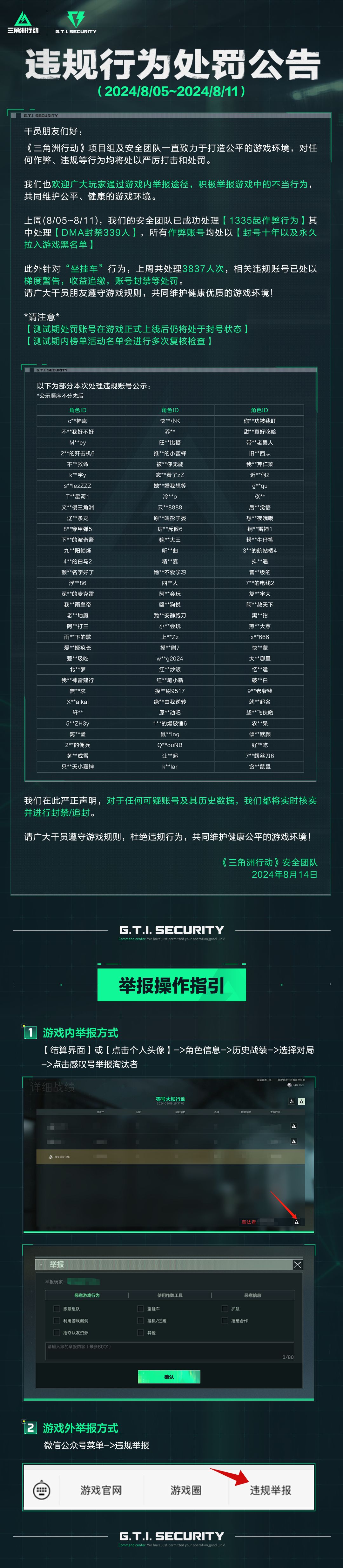 上周(8/05~8/11),我们的安全团队已成功处理1335起作弊行为,其中处理DMA封禁339人,所有作弊账号均处以封号十年以及永久拉入游戏黑名单。