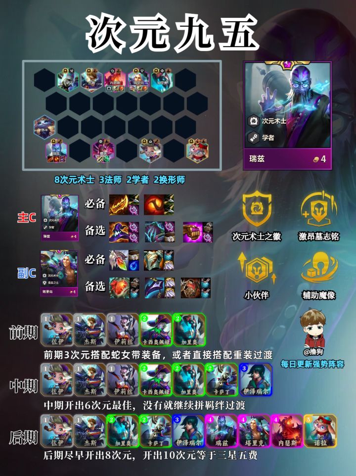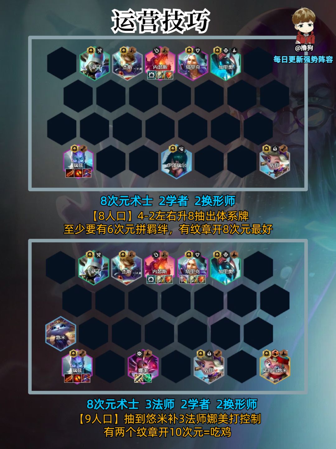 ①有次元转优先,3次元打工过渡很强,用次元开局过渡的时候如果次元牌比较多也可以玩,但要上9开3法②先做瑞兹的羊刀,任意射手都可以带羊刀过渡,做个红buff或鬼书打重伤,不然没法过剑姬尼菈复苏等回血阵容③瑞兹和对方主C站同侧,娜美站对角有机会配合次元的陨石伊泽瑞尔等直接秒杀对方c位