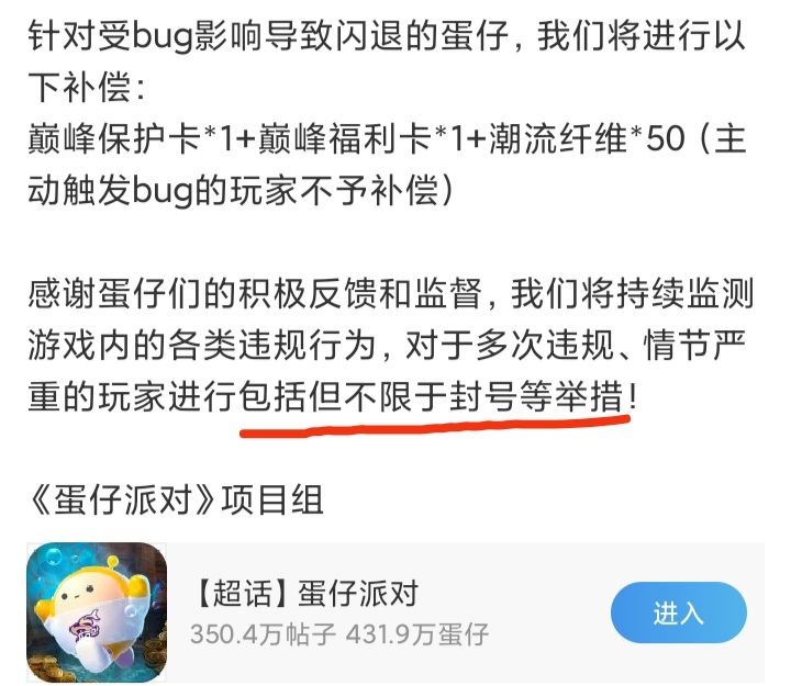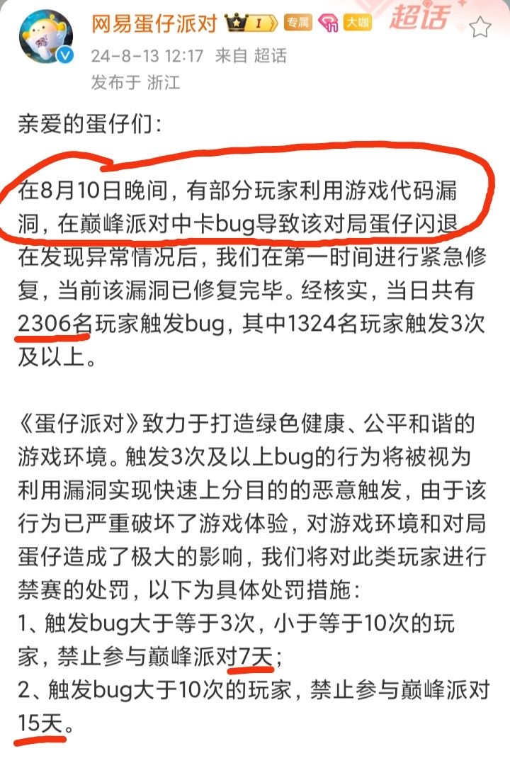 8/13号中午,《蛋仔派对》官博发文称,发现有玩家利用游戏代码漏洞,在巅峰派对中卡bug导致闪退❗❗❗