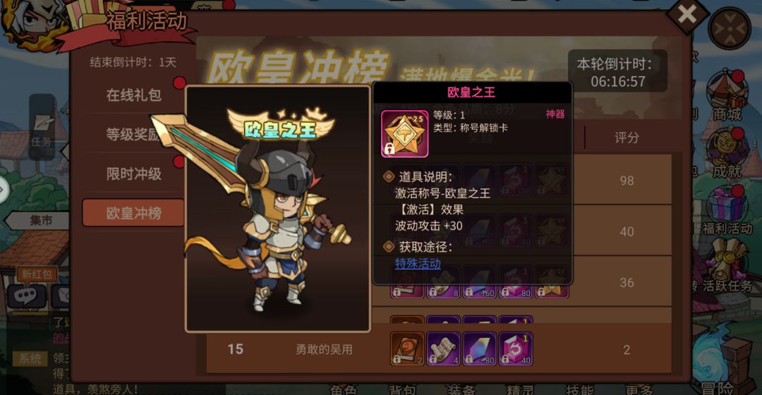 公测后每周将开启两轮的欧皇冲榜排行活动,领主挑战BOSS掉落物品品质越高,分数越多,幸运的领主可以通过活动额外获得超阶技能书、平行世界门票、万能碎片、神器装备核心、欧皇称号等多种奖励,让幸运加倍吧!