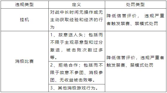 2、信誉评价分扣除将依据违规严重程度倍增;违规严重程度评估包含而不限于:挂机时长、消极比赛频率及同账号多次、多类违规情况等