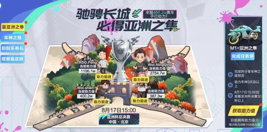 即日起,车手们完成活跃任务和观赛任务,即可助力你心目中的车神驰骋长城!最终完成任务即可领取永久M1摩托亚洲之隼!