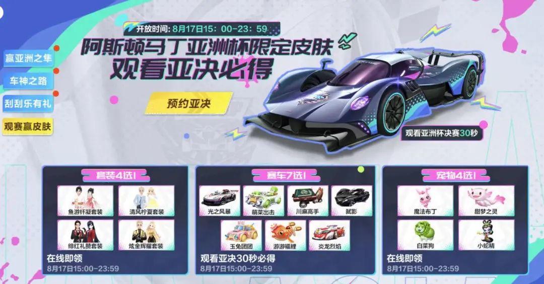 亚洲杯总决赛高燃开启,好礼来助阵!8月17日15:00,车手们前往游戏内-赛事中心观看亚洲杯总决赛30秒即可免费领取赛车皮肤阿斯顿马丁 耀翼!同时还有赛车7选1活动等你来参与~