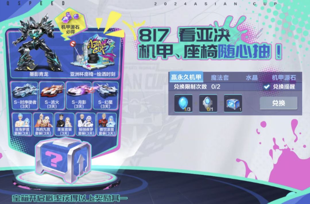 即日起,车手们登录游戏并完成指定任务赢取亚洲杯水晶,8月17日完成观赛任务获得水晶熔铸器,即可使用以上道具合成宝箱。开启宝箱必得机甲源石,更有机会赢取永久T车墨影青龙和全新亚洲杯座椅-绘洒时刻等奖励!