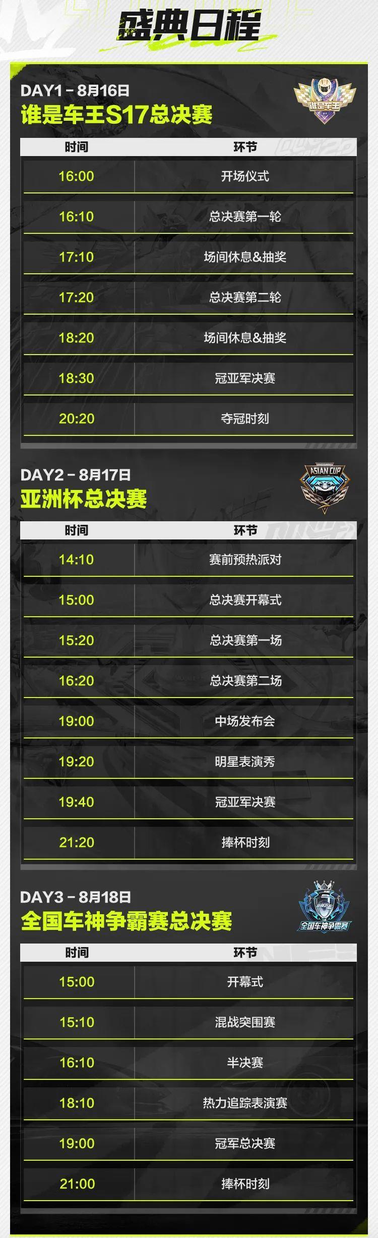 车手们看过来!天美竞速盛典日程全曝光!三大竞速赛事分别何时开战、都有什么精彩环节?看这里就知道啦!8月17日15:00,QQ飞车手游亚洲杯总决赛准时开幕,车手们记得前来观赛哦~