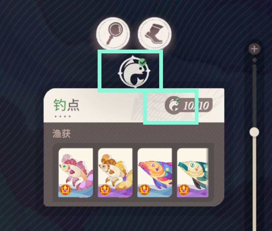 下面的是加强版,每天有5次机会,必出银冠及以上的鱼,每天会有一个钓点变成金的