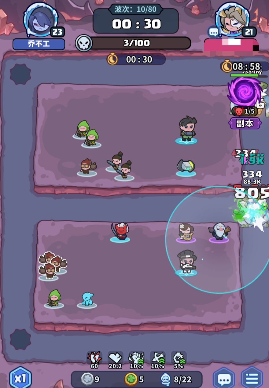 对于一般玩家,困难局第10波的boss,起码要有1个紫色英雄,过起来才不会费劲。而卡白色英雄的玩法的代价是不升“强化概率”,第10波召唤出紫色英雄的概率不高,会把压力都堆给友军,一旦友军运气不佳,极有可能会漏掉我方boss,往往这时我方又用领主追着boss打,不懂得放,使boss晕在那里挨时间,倒计时结束导致战局失利。