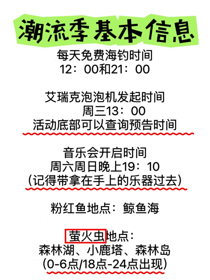 心动小镇艾瑞克泡泡机时间/音乐会开启时间/粉红鱼位置/萤火虫位置