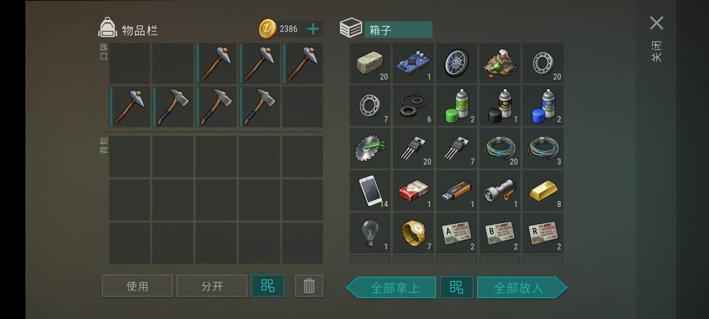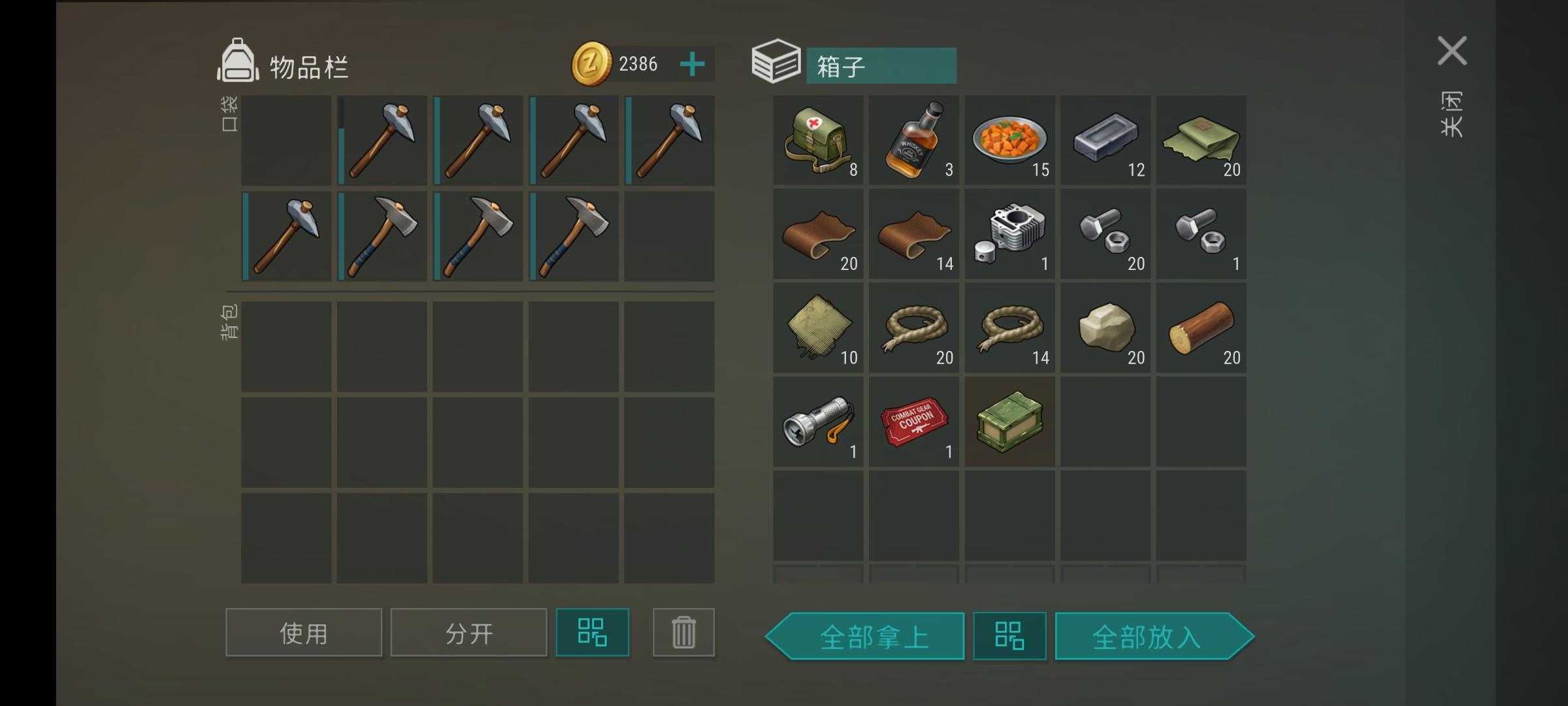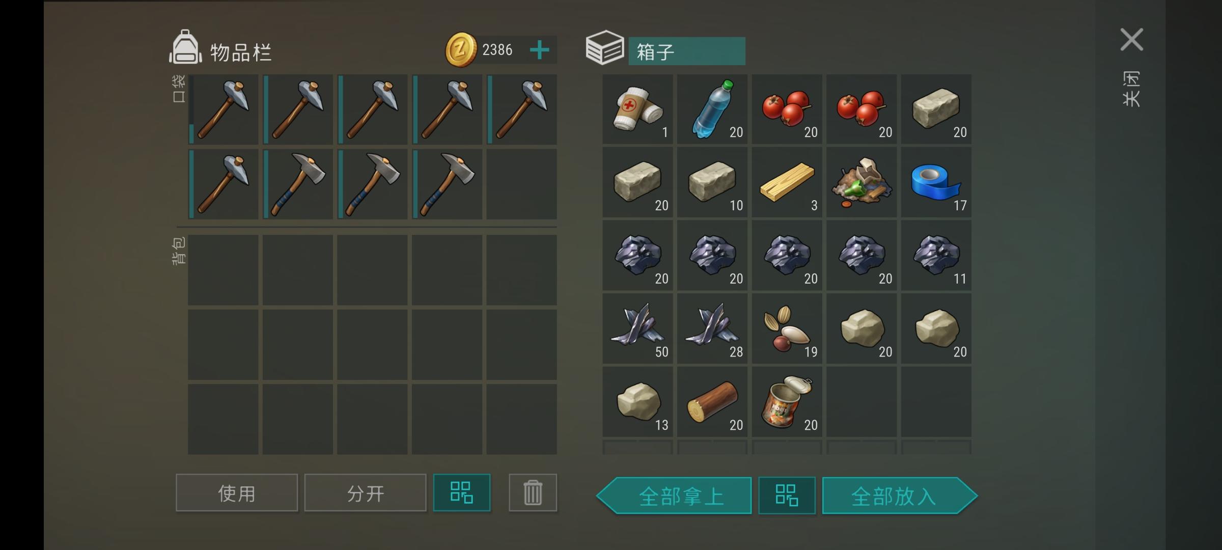 ID看着像富家,但是却出乎意料的穷呢。可以带一把铁斧和五把石斧。三个箱子的物品如下。木工台里面有木板和木头,熔炉里面是铁矿和空罐头,营火里面有一组萝卜