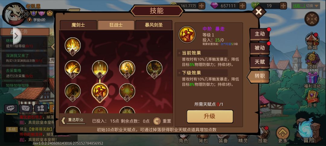 职业技能也一样优先选择提升伤害的技能,狂战士专属前中期只需要点一级就够了,后期再拉满。