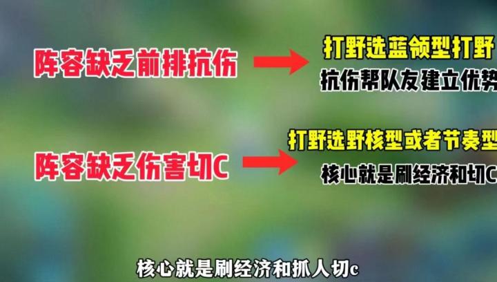 如果阵容里面缺乏前排扛伤,那么打野可以选择蓝领型打野,主要扛伤害帮队友建立优势!如果阵容里面缺乏伤害切c,那么打野可以选择野核型或者节奏型打野,核心就是刷经济和抓人切c!