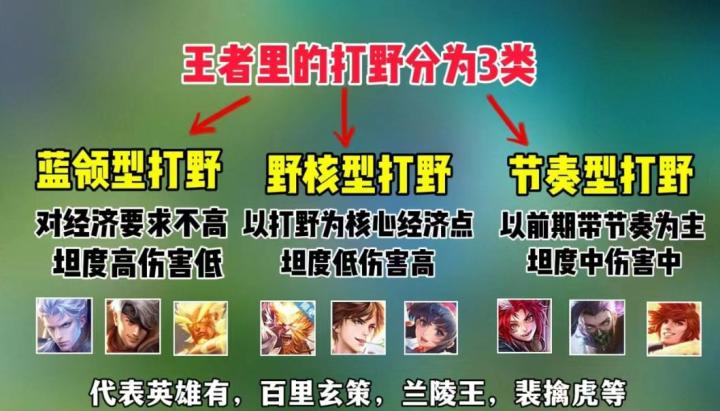 王者里的打野分为3类,分别是蓝领型打野,野核型打野和节奏型打野,其中,蓝领型打野,对经济要求不高,坦度高伤害低,代表英雄有肉凯,夏侯惇,盘古等,野核型打野,以打野为核心经济点,坦度低伤害高,代表英雄有猴子,李白,娜可露露等,节奏型打野,以前期带节奏为主,坦度中伤害中,代表英雄有百里玄策,兰陵王,裴擒虎等。