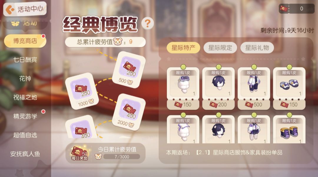 奥比们期待的兑换商店返场来啦!活动期间,小奥比们通过劳作、采伐、挖矿、钓鱼等行为累积疲劳值并获得获得「博览门票」,使用「博览门票」即可在「博览商店」中兑换往期主题商店的服饰、家具等物品,本次开启「 星际引导员套装」「星际播报员套装」「来自星星的卫衣」「两根天线发饰」「闪耀星球挎包」时装以及「机械音乐播放台」「机械悬浮办公椅」「机械服务管家」等家具的兑换,喜欢的小奥比可不要错过哦。