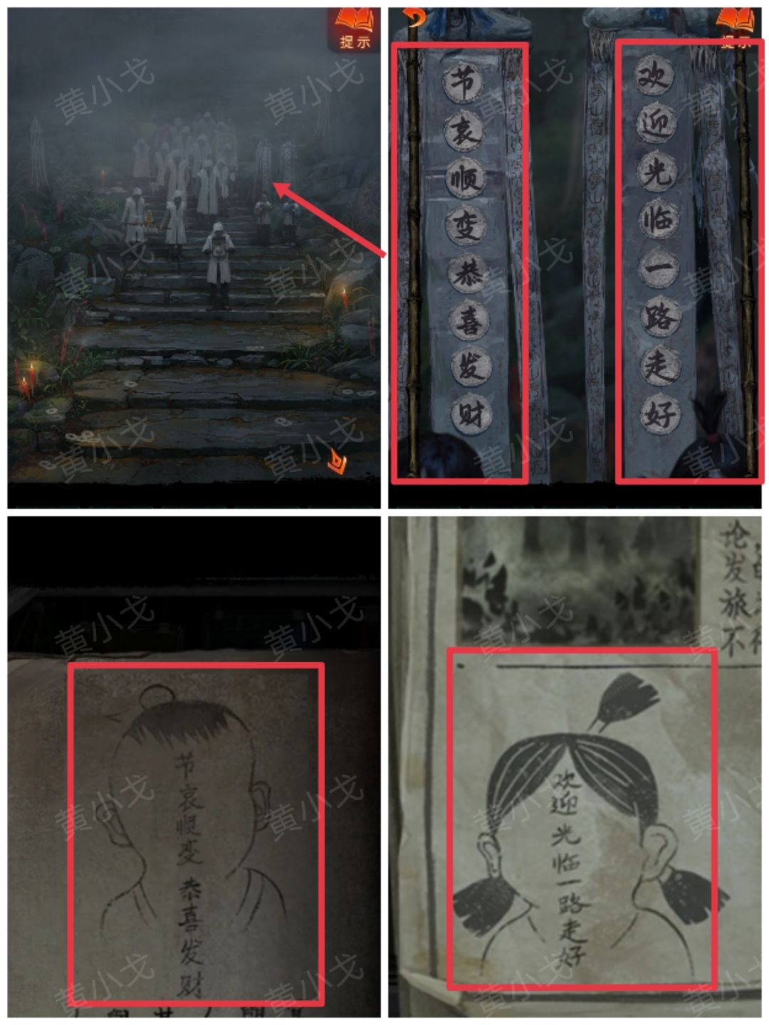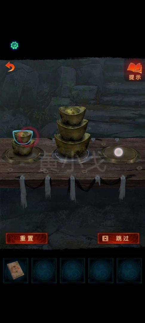 23.(魁阙关内)点击左侧怪人抬着的担子,放上【纸元宝】,完成汉诺塔小游戏;触发机关,注意布条上的图案及位置
