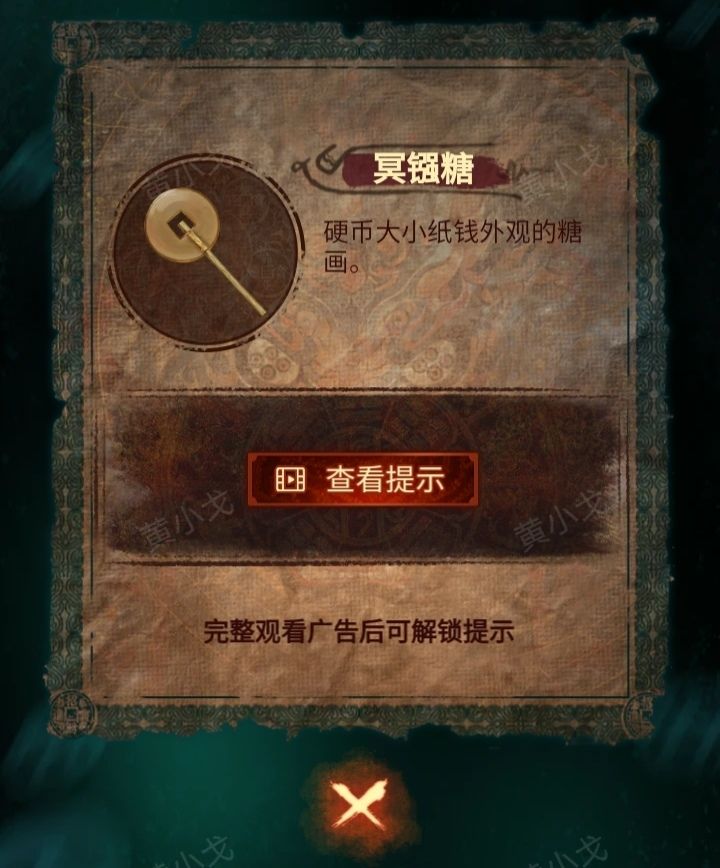 4.点击小吃店,根据《无字谶》上的线索(一敲四牲三子孙,第二第五沏楮尘,心急莫忘有冥镪),按(四牲脍、楮尘糊、子孙饭、冥镪糖、楮尘糊)的顺序点击菜单牌;触发剧情,获得【楮尘糊】