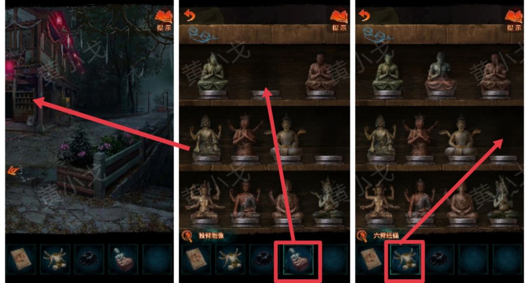 12.(路口)点击架子,放上【独臂雕像】和【六臂纸佣】