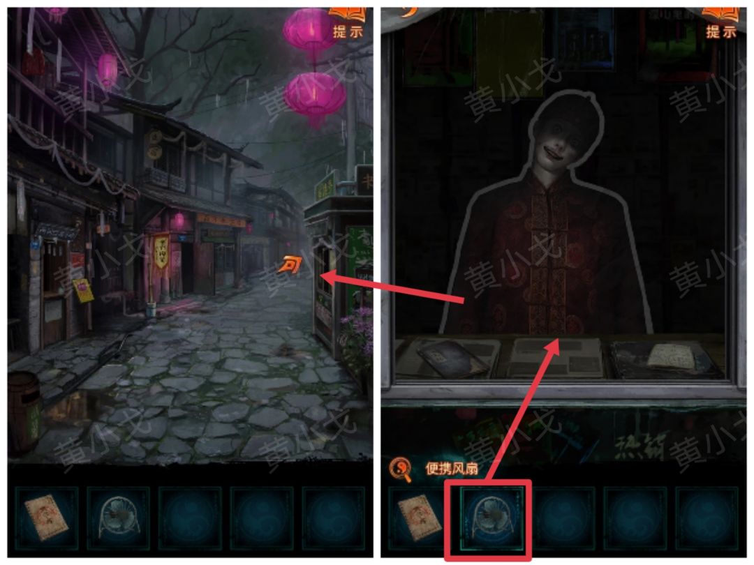 26.(魁阙关)点击货郎,根据货郎背后红布上的字(亡者之画,可易一扇),拿【遗照】换取【便携风扇】